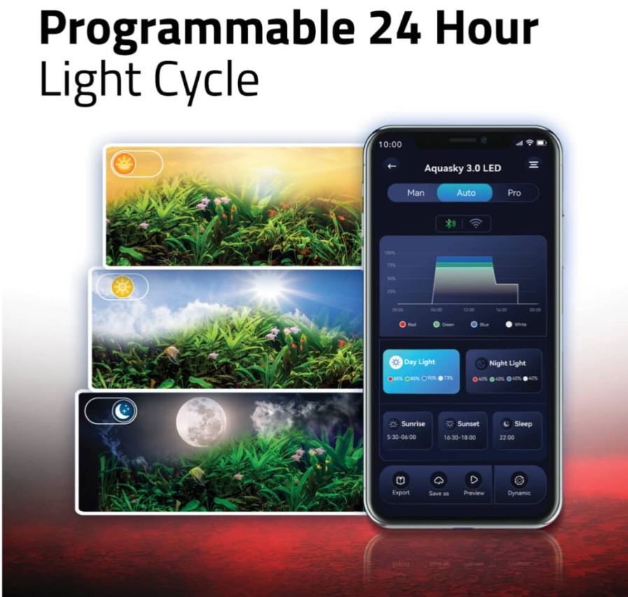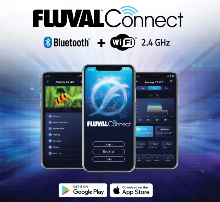 With its programmable 24-hour light cycle, you can effortlessly mimic natural sun and moon settings, adding to a truly natural viewing experience. Controlled exclusively via the FluvalConnect mobile app, Aquasky 3.0 boasts seamless Bluetooth + Wi-Fi (2.4 GHz) connectivity, ensuring versatile and easy operation. Several mounting options come standard, including extendable brackets, under canopy hanging clips, and a T5/T8 retrofit kit.